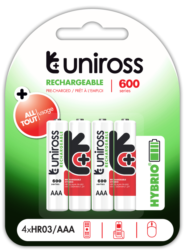 Uniross AAA 600 Hybrio Rechargable Batteries 4 Pcs