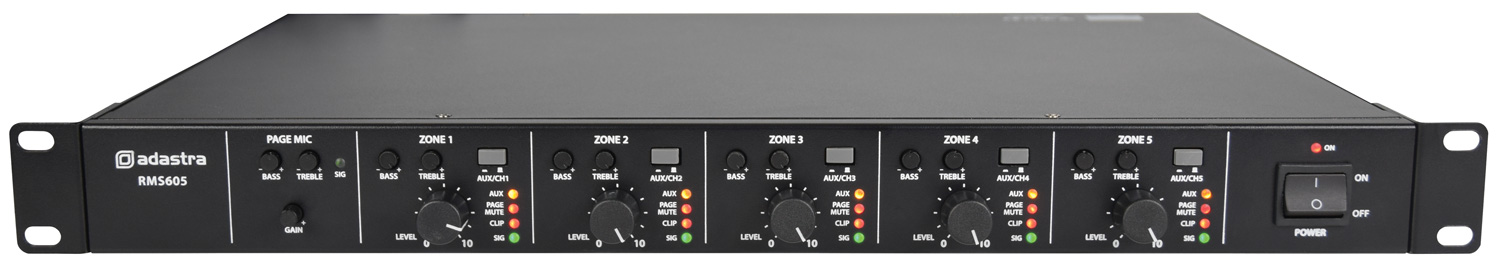 Multi-channel 100V slave amplifier with independent outputs for 100V or 4-16 Ohm speakers. Each amplifier channel has its own independent line input, which can be switched to a global auxiliary, providing the option of the same input to several of the amplifier channels if required. A paging microphone input is provided for voice alerts and a 24V mute terminal can be connected to an alarm panel for emergency evacuation override. Class D circuit design and efficient toroidal transformers have enabled a design which fits into a 1U rack-mount housing. The RMS-series amplifiers can be applied as high power slave units or equally as a fully independent zoning system for a multi-room installation.