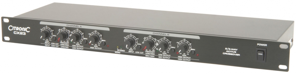 The CX23 is a 2-way stereo or 3-way mono active crossover designed to split frequencies so that low frequencies are delivered to the amp driving the sub cabinets and mid/top frequencies are delivered to the amp driving the mid/top frequency cabs. This type of system is more efficient and delivers more accurate sound quality, especially in larger PA systems.