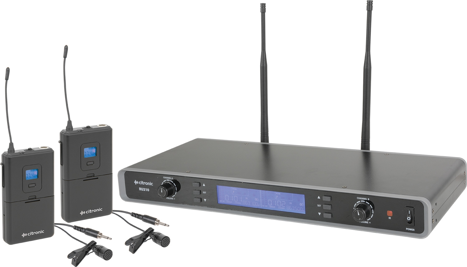 Dual channel PLL tuneable UHF wireless system with 2 beltpack transmitters and a choice of neckband microphones or lavalier microphones. The receiver unit is compatible with standard 19" racks using the included rack ears and front mounting antenna accessories. The RF carrier frequency is selected on the receiver and synchronized to the transmitter via infra-red at the touch of a button. Up to 2 RU210 systems can be operated together on the EU licence-free band.