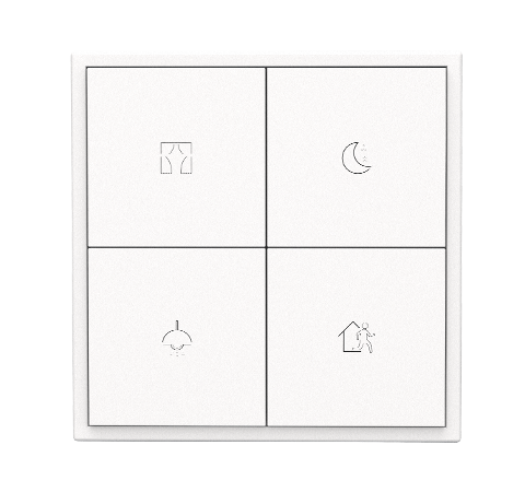KNX Tile series Button Panel 2.0 contains 1/2/4- button panels. Icons and text of each button supports laser labelling. With built- in RGB backlight for each pushbutton, the color and brightness level can be set by ETS or manually set on the panel. The panels support controls of lighting, curtains, scenes, music, etc.