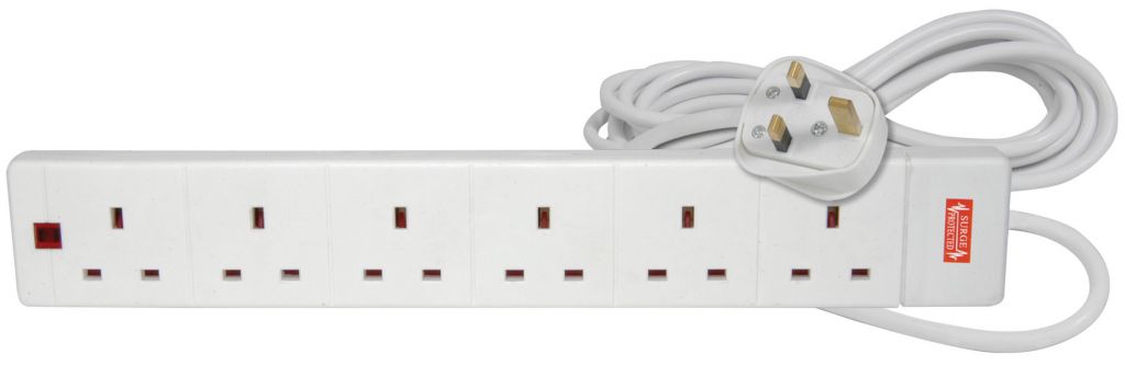 Mains extension leads with surge and spike protection and neon indicator.