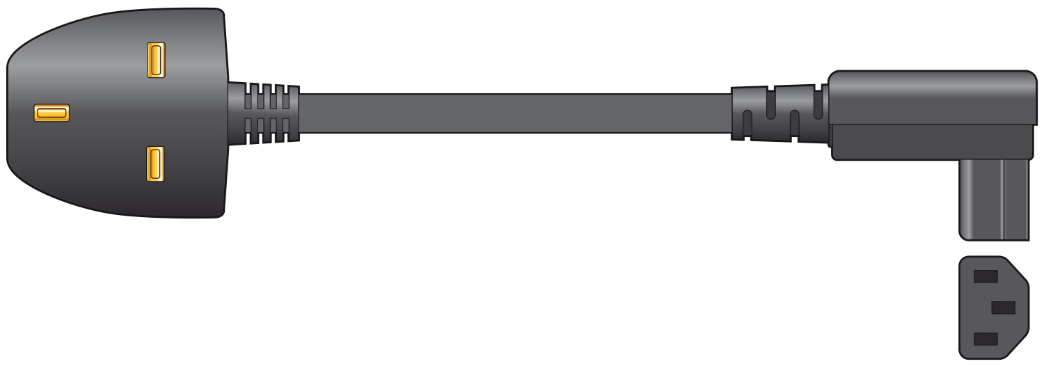 UK 3 pin plug to right angle IEC C13 female plug, 3 core mains power lead, suitable for connecting power to general electronic equipment of up to 2300W.