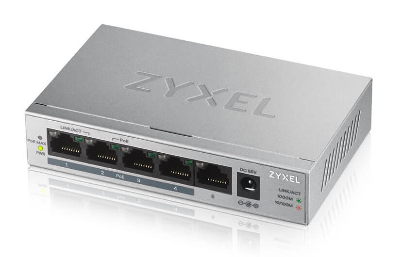 The Zyxel GS1005HP GbE Unmanaged PoE Switch is equipped with 5 Gigabit Ethernet ports, 4 of which are PoE ports that can deliver up to 60 w of total PoE budget. The GS1005HP can easily connect